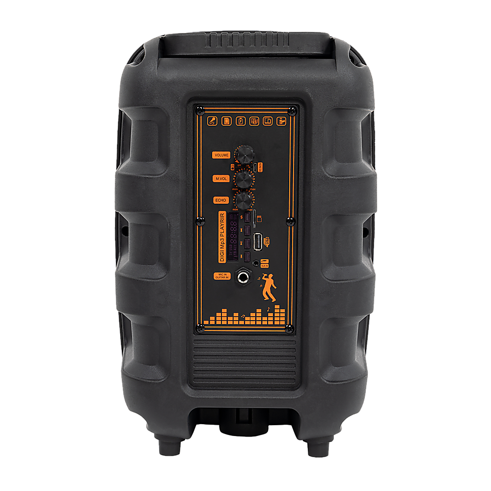 This speaker also offers intuitive sound settings including ECHO, VOLUME, and MIC controls. The built-in rechargeable battery provides up to 5 hours of playtime at medium volume, and its sturdy top handle and telescopic carrying handle make it easy to transport wherever the party takes you. Let the music be your companion and amplify the fun wherever you go with this remarkable Bluetooth speaker.