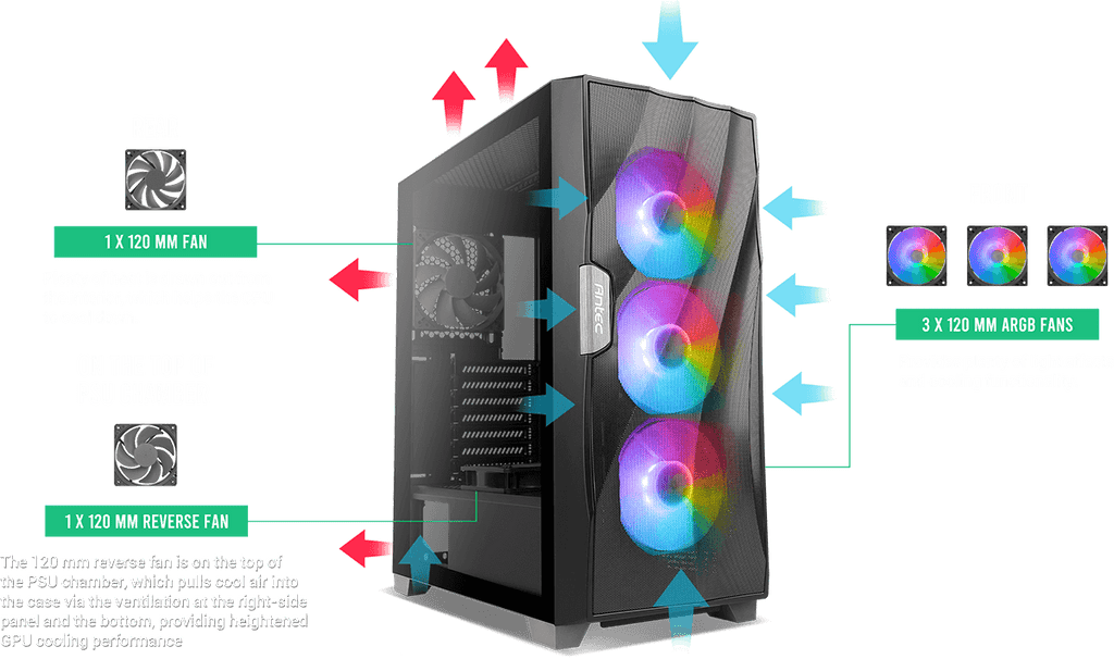 The DF700 FLUX mid-tower gaming case is well equipped with an industry-leading design of advanced ventilation, taking the Antec Dark series to the next generation. To cope with the stress of enhanced heat dissipation, Antec developed a revolutionary structure for airflow, providing an improved and powerful cooling solution for your system. The F-LUX Platform.The Ultimate Thermal Performance for Gaming Cases When Intel announced their latest 10th Gen CPU and AMD announced their new Ryzen 3 and 4 CPUs, they all deliver remarkable performance upgrades and better productivity, it also means the functional requirement of PC equipment needs to be taken to the next level, especially the thermal performance. Features Antec F-LUX Platform design enhanced airflow for CPU/GPU (Front, Right, Rear, Top) Wave Front Mesh Designed enhanced airflow LED Controller embedded or SYNC with compatible MBs 5x included Fans. (3x ARGB 16.8M light effects, 1x Rear and 1x PSU Chamber) Support for High End VGA up to 405mm and PSU 205mm length Cable Management with ample room to hide cables Tempered Glass and Tool FREE. Dimensions 467 x 220 x 486 mm (DxWxH) Form Factor Mid tower Materials Steel + Plastic Mainboard Support ATX , Micro-ATX, Mini-ITX Front Access & Controls Power, LED Control Button, 2 x USB3.0, HD-AUDIO Side Panel 4 mm Tempered Glass Side Panel Expansion & Drive Bays Expansion Slots 7 5.25\' - 3.5\'/2.5\' (convertible) 3/2 2.5\' 3 Fan Front 3 x 120mm / 3 x 140mm Top 3 x 120mm / 2 x 140mm Power Supply Shroud 2 x 120mm Rear 1 x 120mm Included Fan(s) 3 x 120mm ARGB fans in front 1 x 120mm fan (Reverse Fan) on PSU shroud & 1 x 120mm fan in rear