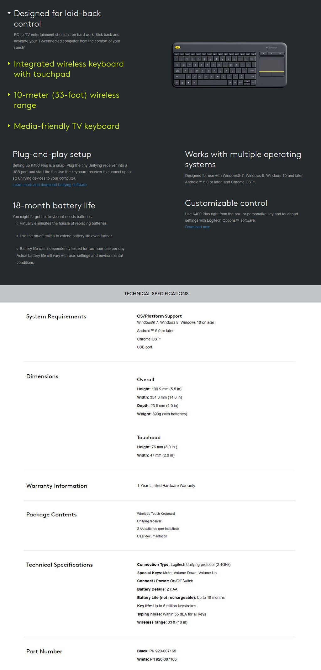 Package Content: 1 x 920-007165: Logitech K400 PLUS Touch Wireless keyboard - Black