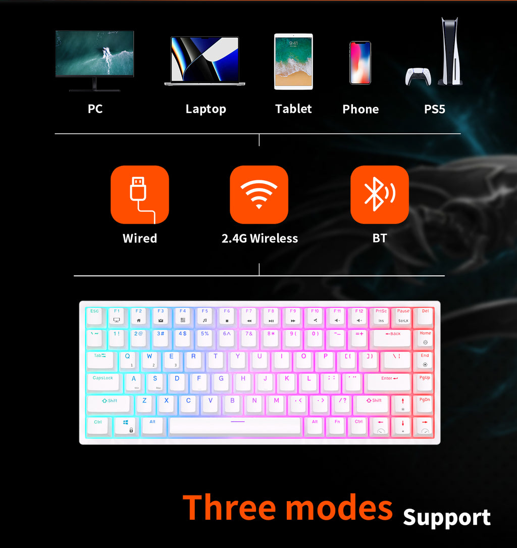 That is THREE MODES: Believe it or not, this is the first generation of RGB three-mode wireless keyboards on the market. Wireless mode with stable bluetooth 5.0, hassle-free 2.4Ghz dongle plus USB-C wired mode set no limits about your keyboard connection.