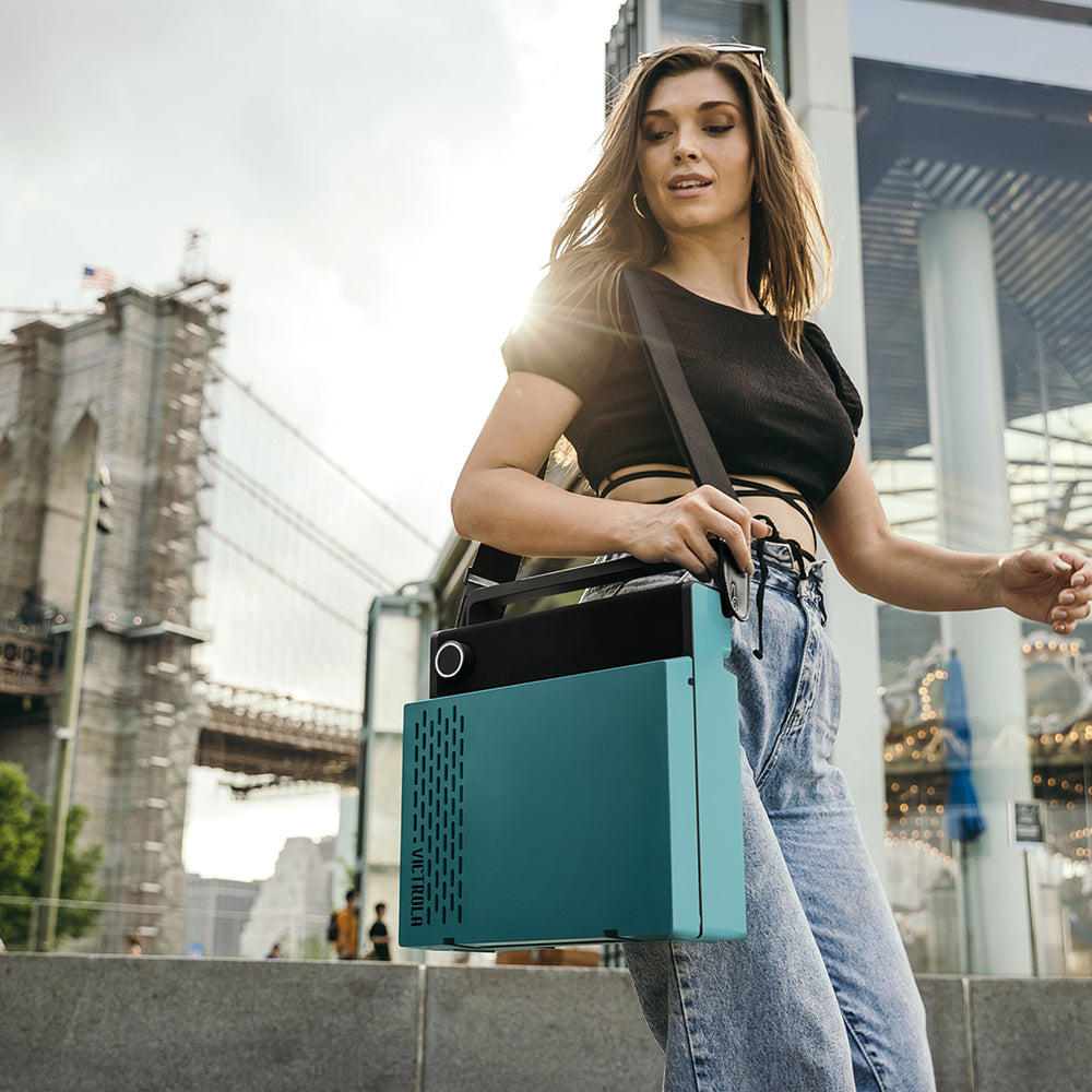 Victrola Revolution Go Turntable - Blue + Bundled Majority D40 Bluetooth Speakers - Introducing the award-winning Victrola Revolution GO, the world's pioneering portable, rechargeable Bluetooth record player. With its battery-powered design, the Revolution GO lets you enjoy your vinyl collection wherever you go.